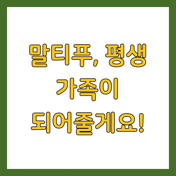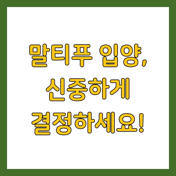 말티푸 입양, 귀여움에 끌려 충동적으로 결정해서는 안 됩니다. 말티푸의 특징과 키우는 방법을 충분히 이해하고, 나와 잘 맞는 반려견인지 신중하게 판단해야 합니다. 책임감 있는 입양, 말티푸와 평생 함께할 행복의 시작입니다!
