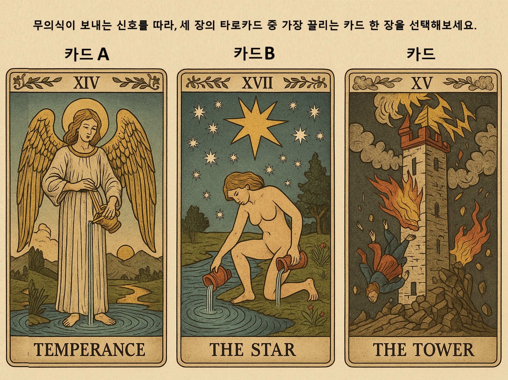 아래의 세 장 중, 지금 가장 마음이 끌리는 카드 한 장을 선택해 주세요.